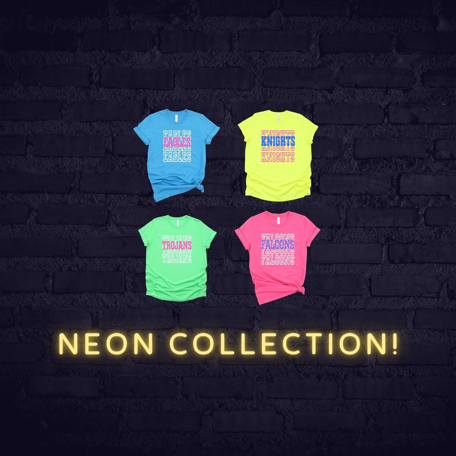 Bright, bold and full of spirit! Tees and hoodies featuring your mascot rocking neon glasses- stand out in the crow!